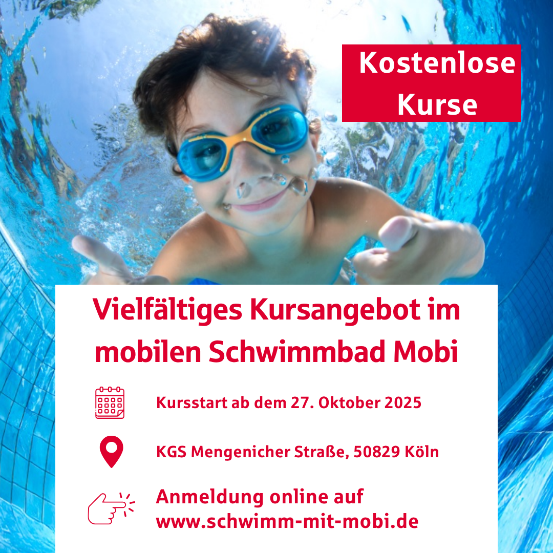 Das mobile Schwimmbad Mobi ist an seinem 1. Standort an der KGS Mengenicher Straße angekommen – und mit ihm starten neue Kurse für Kinder, Erwachsene und Senioren.